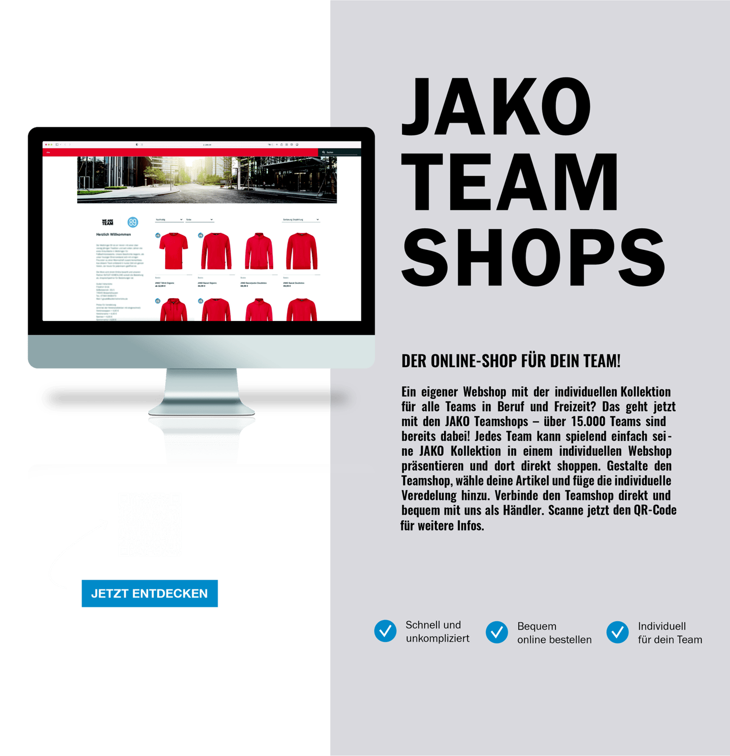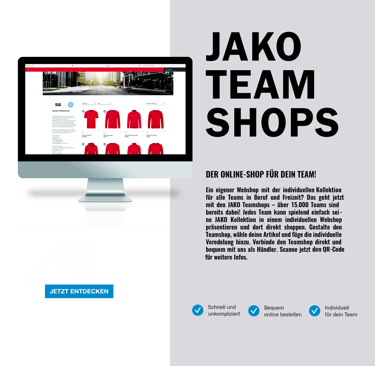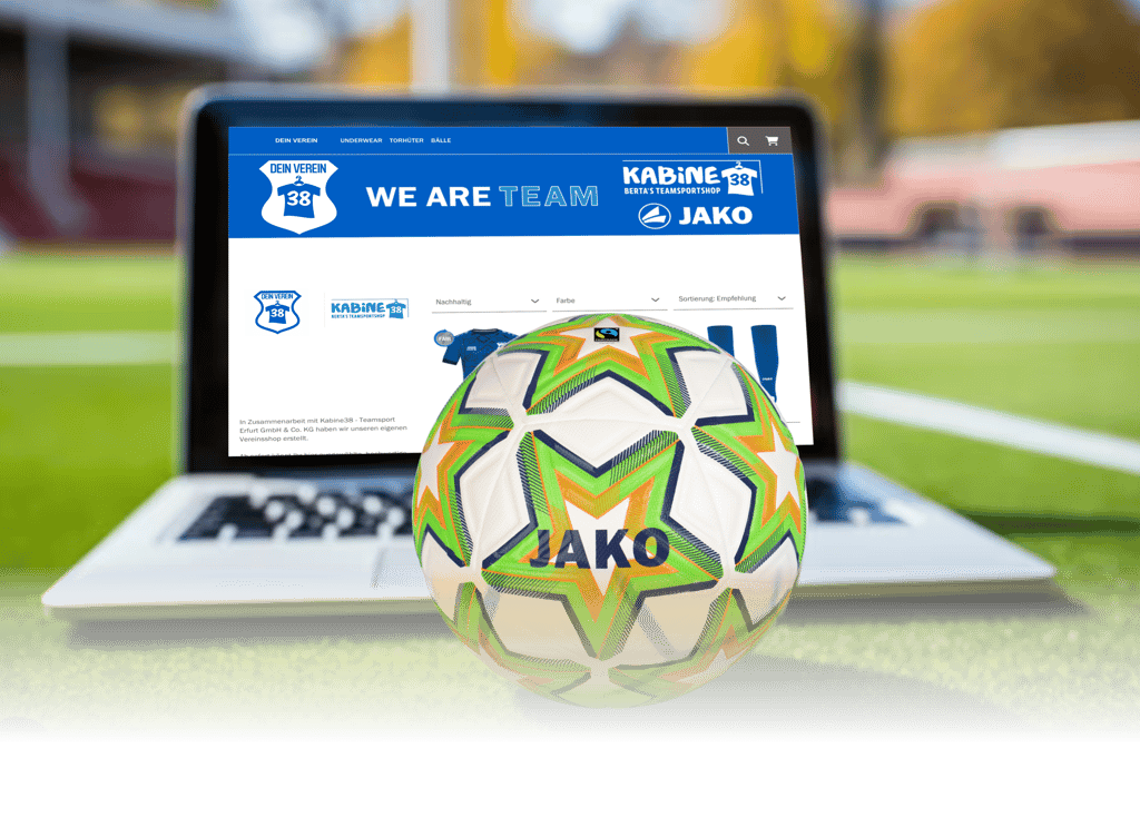 Wir erstellen kostenfrei euren Teamshop mit den von euch ausgewählten JAKO-Produkten. Jeder Verein, jede Firma ist herzlich willkommen in der KABINE38